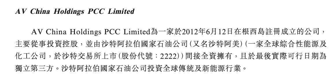 而AV China Holdings PCC Limited为一家于2012年6月12日在根西岛注册成立的公司,主要从事投资控股,并由沙特阿拉伯国家石油公司(又名沙特阿美)间接全资拥有,且于最后实际可行日期为独立第三方。沙特阿拉伯国家石油公司投资全球传统及新能源行业。