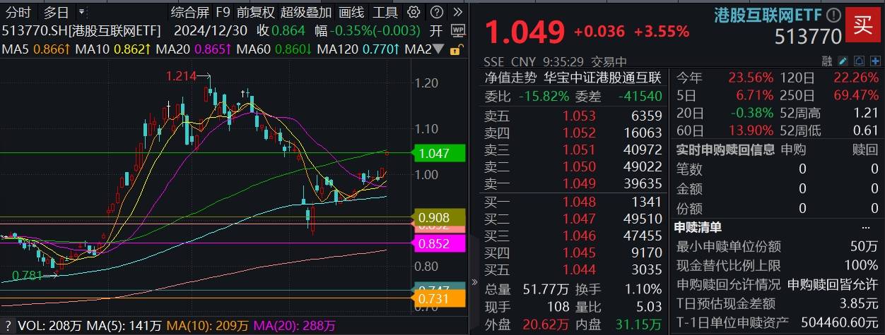 今早(2025年5月6日),港股科网板块继续拉升,中证港股通互联网指数现涨0.44%,相关ETF强势补涨,重仓港股互联网龙头的港股互联网ETF(513770)跳空高开,场内价格现涨3.55%。