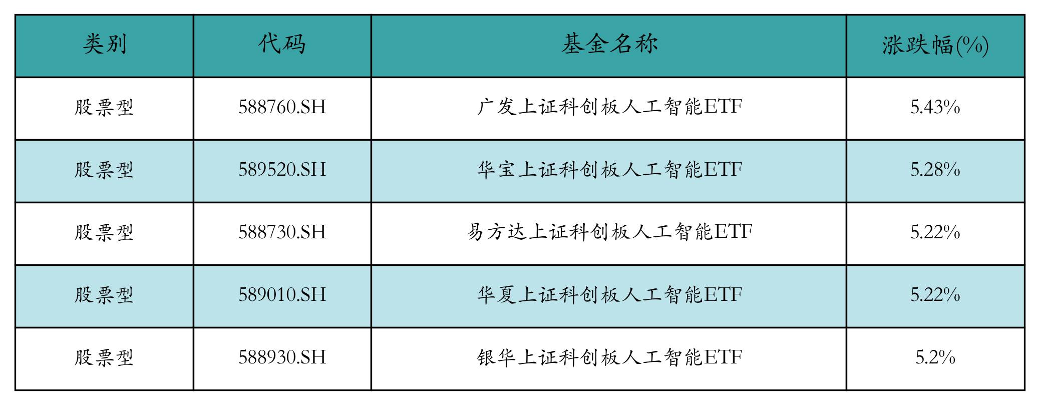 上周股票型ETF涨幅最高的5支ETF及其收益率分别为:广发上证科创板人工智能ETF(5.43%)、华宝上证科创板人工智能ETF(5.28%)、易方达上证科创板人工智能ETF(5.22%)、华夏上证科创板人工智能ETF(5.22%)、银华上证科创板人工智能ETF(5.2%)。详情见下表: