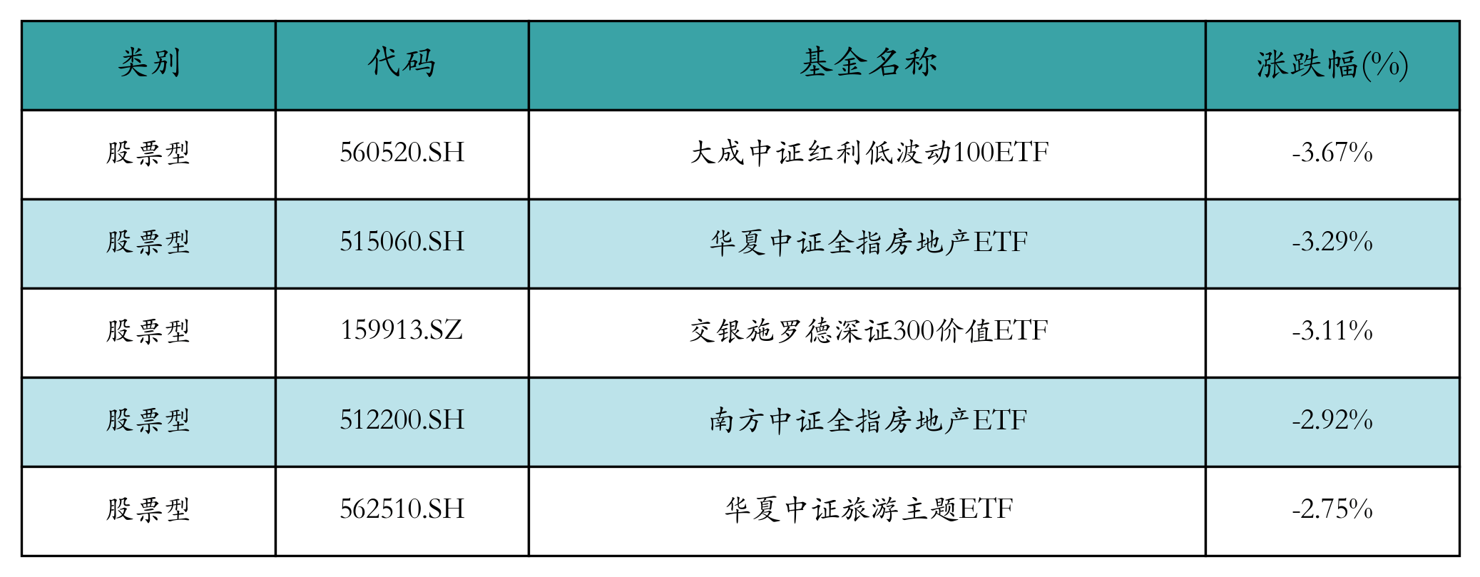上周股票型ETF跌幅最大的5支ETF及其收益率分别为:大成中证红利低波动100ETF(-3.67%)、华夏中证全指房地产ETF(-3.29%)、交银施罗德深证300价值ETF(-3.11%)、南方中证全指房地产ETF(-2.92%)、华夏中证旅游主题ETF(-2.75%)。详情见下表: