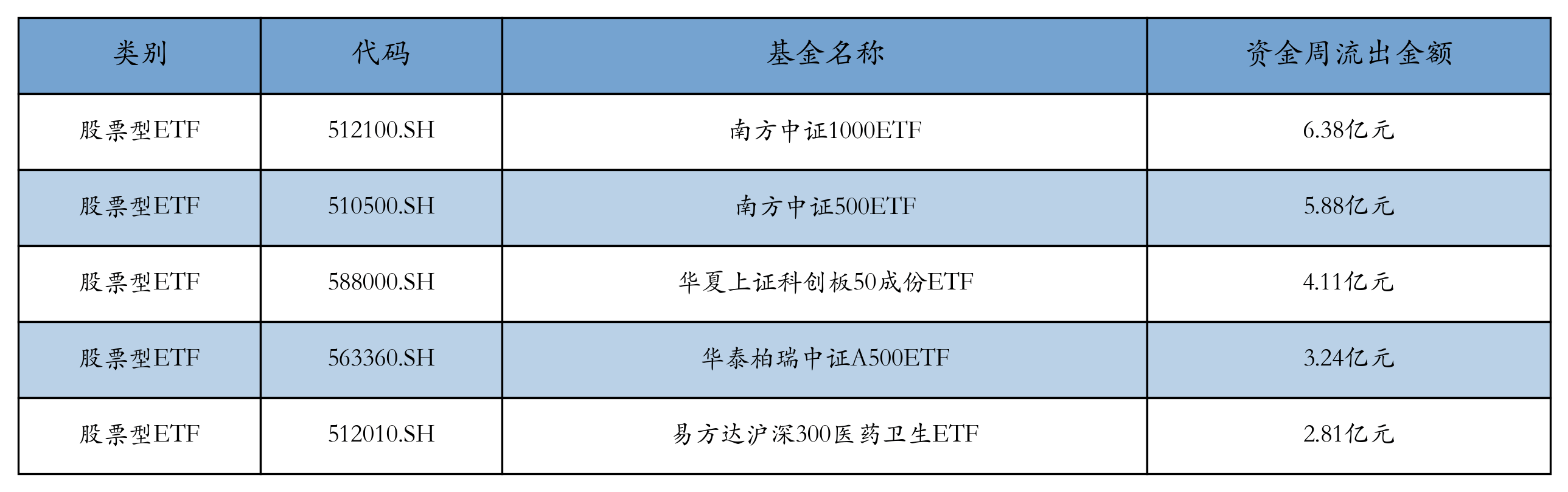 上周股票型ETF资金流出最多的5支ETF及其流出金额分别为:南方中证1000ETF(流出6.38亿元)、南方中证500ETF(流出5.88亿元)、华夏上证科创板50成份ETF(流出4.11亿元)、华泰柏瑞中证A500ETF(流出3.24亿元)、易方达沪深300医药卫生ETF(流出2.81亿元)。详情见下表: