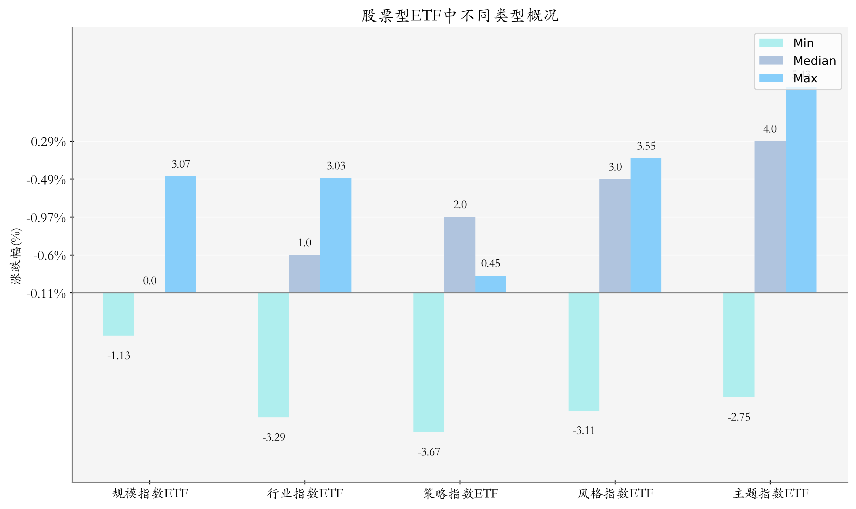 上周股票型ETF周度收益率中位数为-0.17%%。其中按照不同分类,规模指数ETF中易方达上证科创板100增强策略ETF周度收益率最高,为3.07%;行业指数ETF中南方中证全指计算机ETF周度收益率最高,为3.03%;策略指数ETF中华夏创业板低波价值ETF周度收益率最高,为0.45%;风格指数ETF中易方达上证科创板成长ETF周度收益率最高,为3.55%;主题指数ETF中广发上证科创板人工智能ETF周度收益率最高,为5.43%。