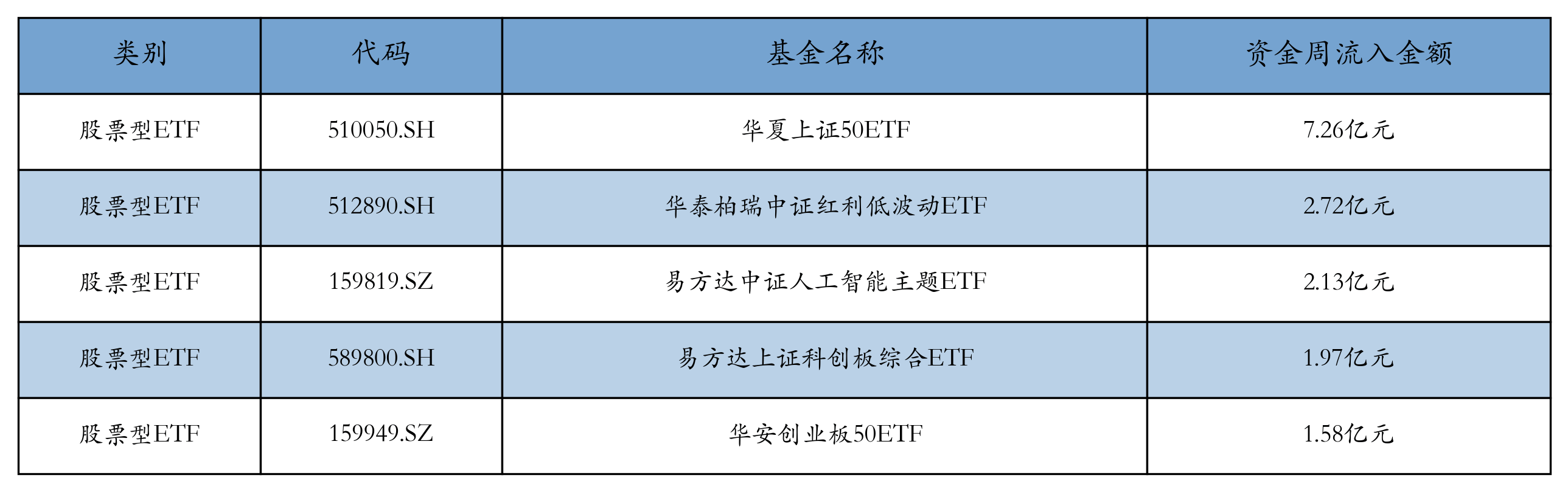 上周股票型ETF资金流入最多的5支ETF及其流入金额分别为:华夏上证50ETF(流入7.26亿元)、华泰柏瑞中证红利低波动ETF(流入2.72亿元)、易方达中证人工智能主题ETF(流入2.13亿元)、易方达上证科创板综合ETF(流入1.97亿元)、华安创业板50ETF(流入1.58亿元)。详情见下表: