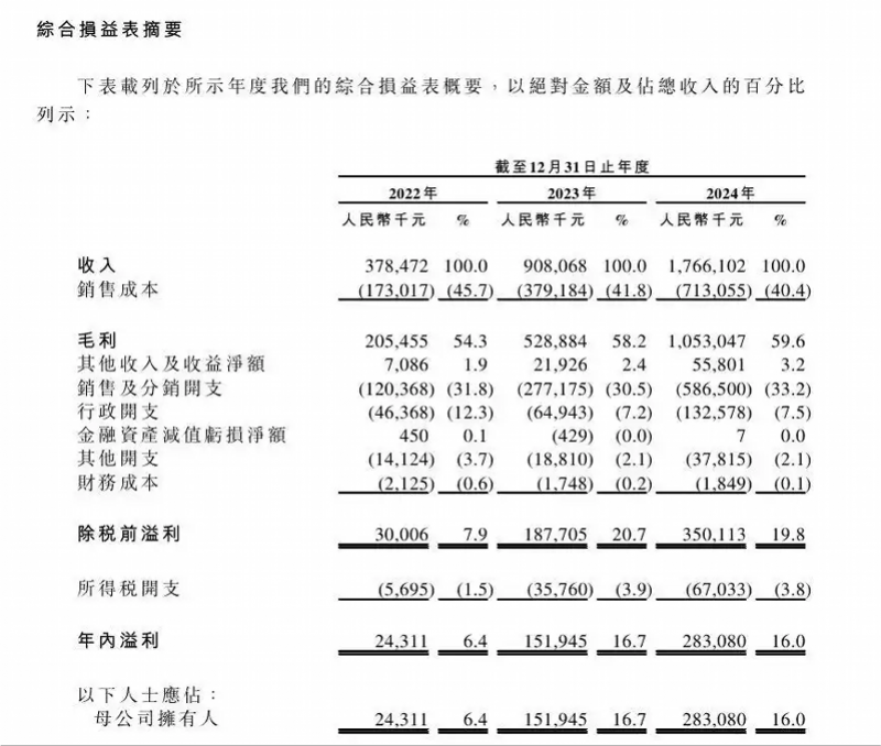 2022年至2024年,净销售额由3.51亿元增至17.33亿元,年复合增长率达122.2%;营收由3.78亿元增至17.66亿元,年复合增长率达115.86%。