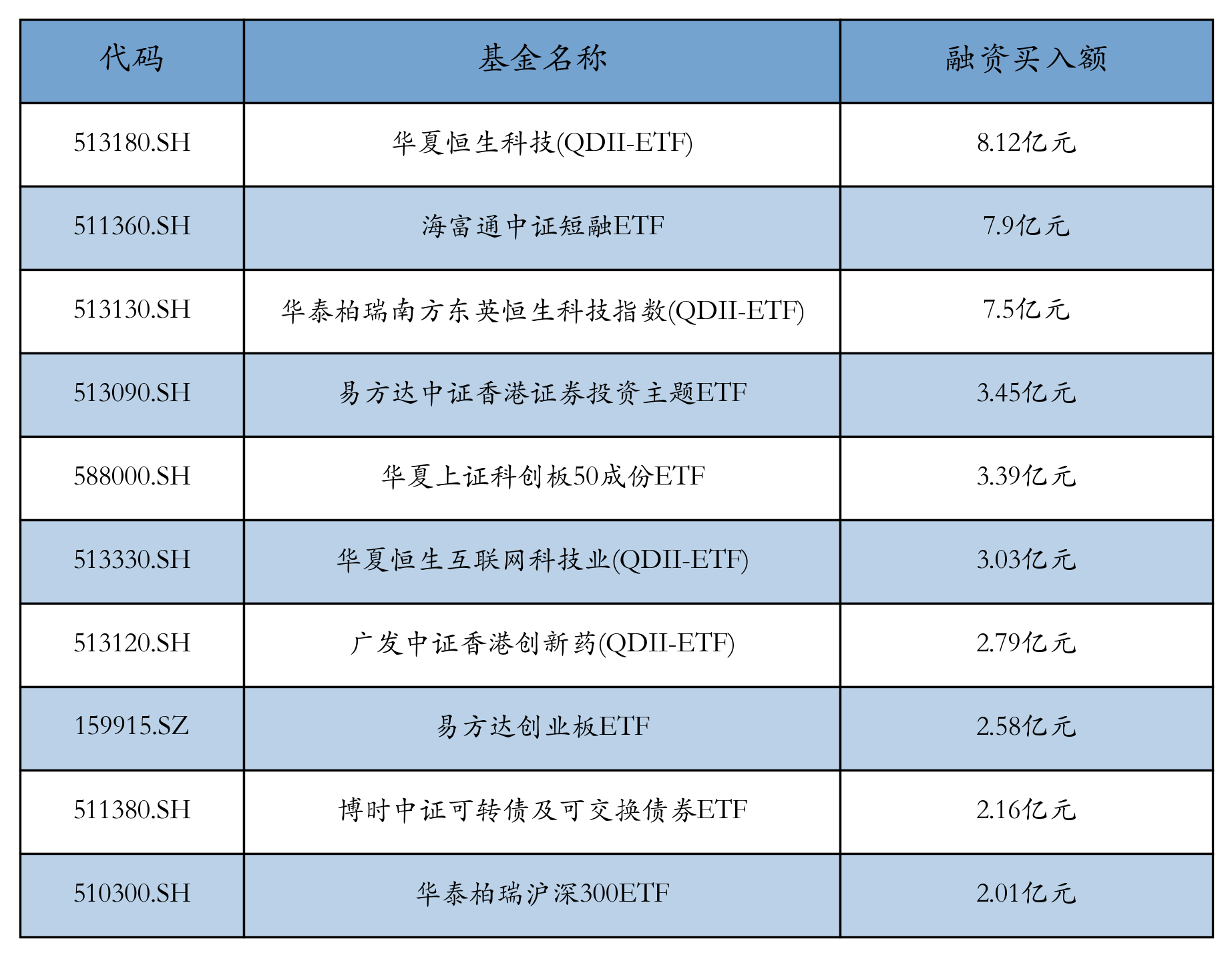 4月30日ETF融资买入额前三位分别为:华夏恒生科技(QDII-ETF)(8.12亿元)、海富通中证短融ETF(7.9亿元)和华泰柏瑞南方东英恒生科技指数(QDII-ETF)(7.5亿元),前10具体见下表: