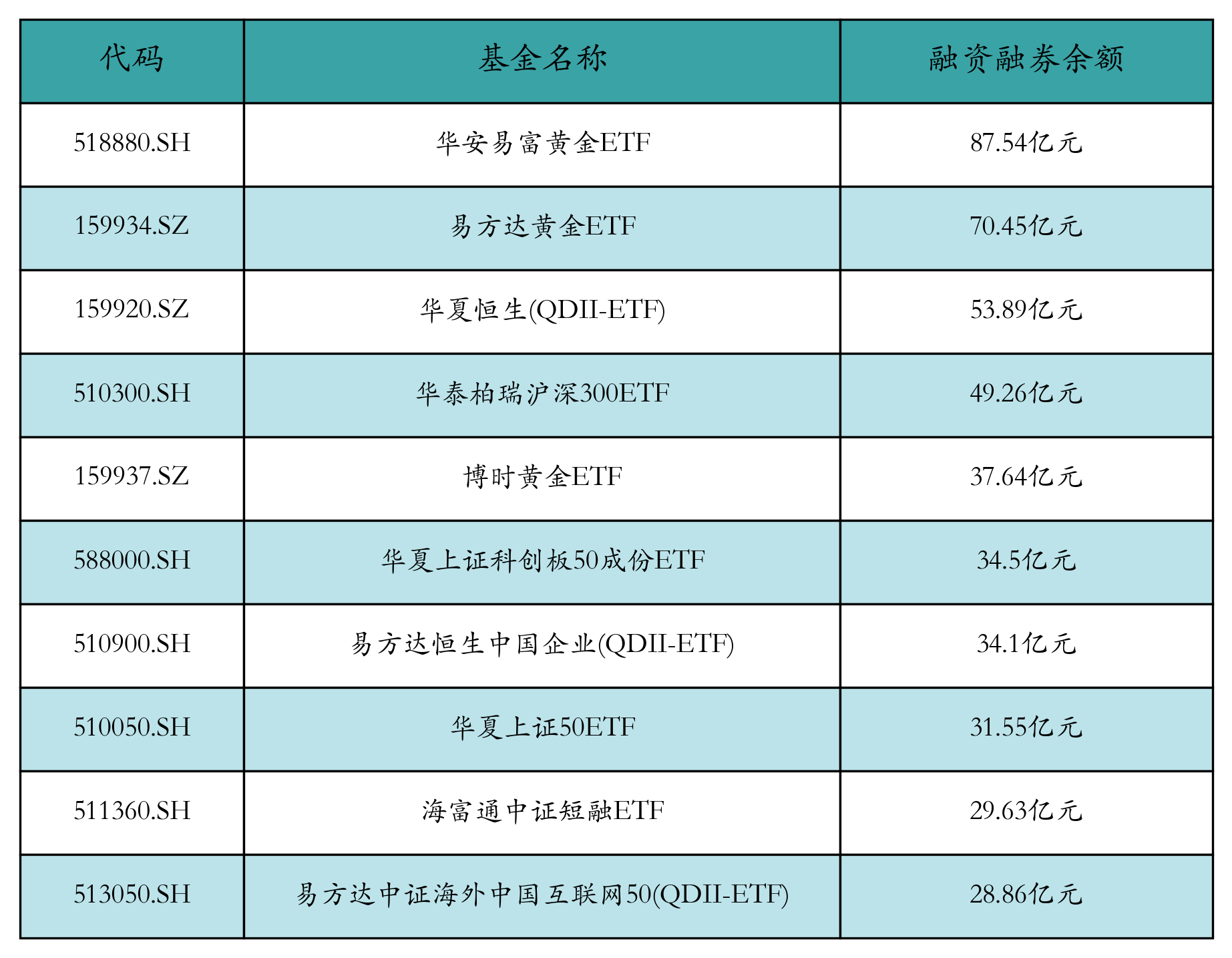 4月30日ETF两融余额前三位分别为:华安易富黄金ETF(87.54亿元)、易方达黄金ETF(70.45亿元)和华夏恒生(QDII-ETF)(53.89亿元),前10具体见下表: