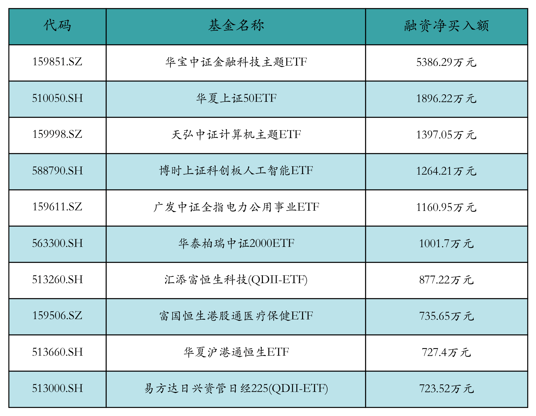 4月30日ETF融资净买入额前三位分别为:华宝中证金融科技主题ETF(5386.29万元)、华夏上证50ETF(1896.22万元)和天弘中证计算机主题ETF(1397.05万元),前10具体见下表:
