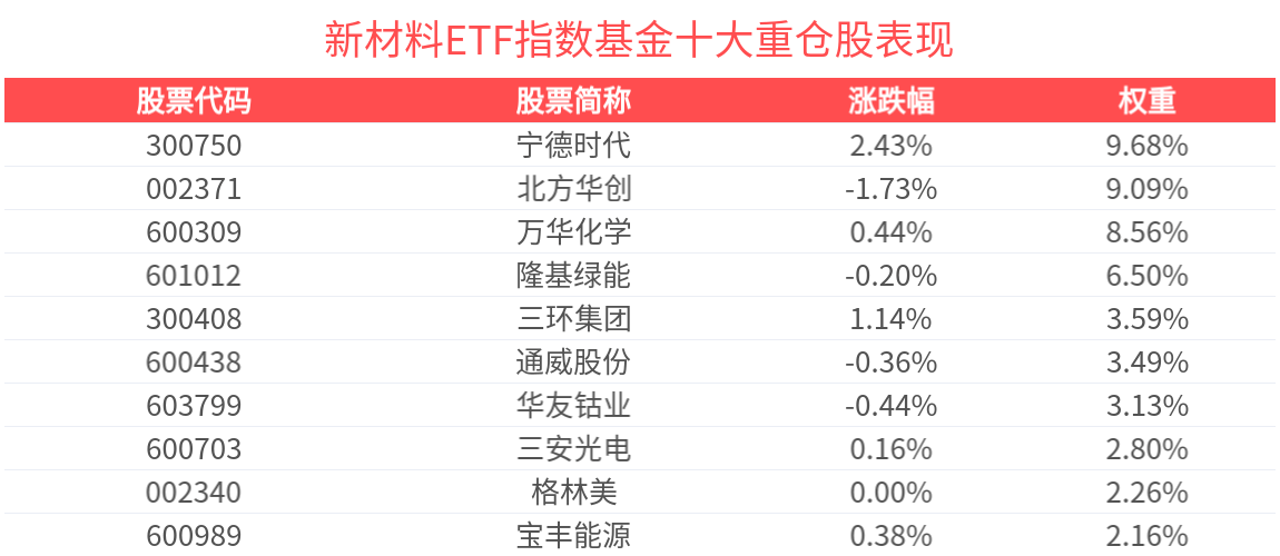 数据显示,截至2025年3月31日,中证新材料主题指数(H30597)前十大权重股分别为宁德时代(300750)、北方华创(002371)、万华化学(600309)、隆基绿能(601012)、三环集团(300408)、通威股份(600438)、华友钴业(603799)、三安光电(600703)、格林美(002340)、宝丰能源(600989),前十大权重股合计占比52.75%。