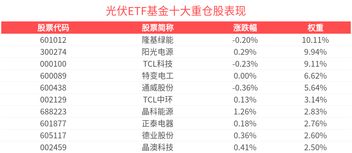 数据显示,截至2025年3月31日,中证光伏产业指数(931151)前十大权重股分别为隆基绿能(601012)、阳光电源(300274)、TCL科技(000100)、特变电工(600089)、通威股份(600438)、TCL中环(002129)、晶科能源(688223)、正泰电器(601877)、德业股份(605117)、晶澳科技(002459),前十大权重股合计占比55.78%。