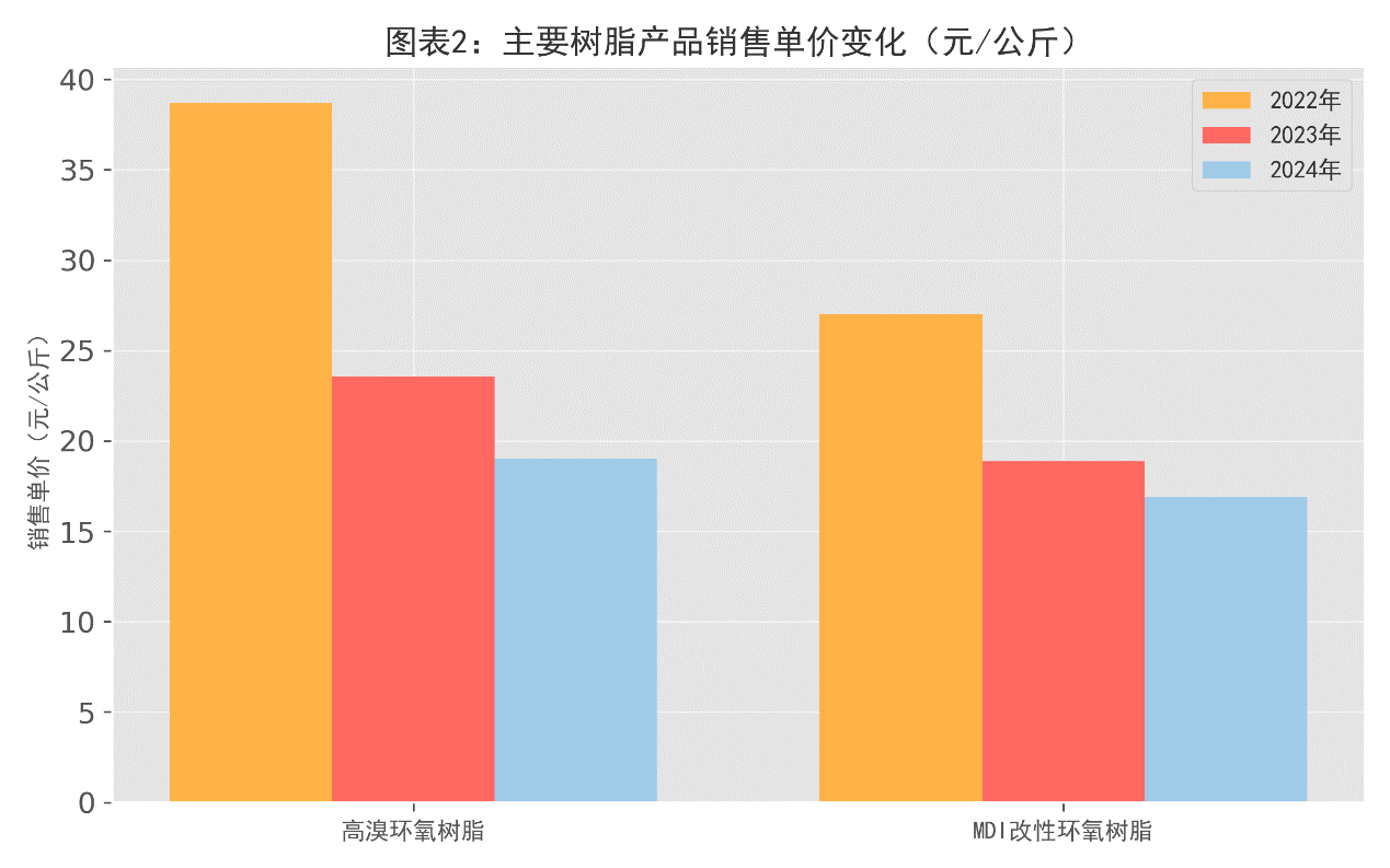 两年间累计来看,公司几乎所有主要产品价格较2022年下跌三成以上。例如,高溴环氧树脂从2022年的38.71元/公斤大幅降至2024年的18.99元/公斤,跌幅超过50%;MDI改性环氧树脂从27.02元/公斤降至16.88元/公斤,跌去约37%。