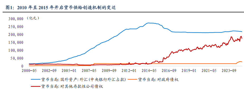 2010年之前由于全球化红利带来外汇收支“双顺差”,以及国内市场化改革、住房等货币化程度不断提高,货币供给和货币需求均旺盛扩张,通货膨胀率也逐级走高,外汇占款成为推动货币供给高增长的主要原因,在当时“数量型调控框架”机制下,货币政策通过提高法定存款准备金率“筑坝拦洪”,将外汇储备扩张而来的货币供给锁定在表内。以存款准备金和存贷款基准利率为主要货币政策操作变量,广义货币供给为中介变量,作用于经济增长和物价稳定的政策目标,在当时金融周期和经济周期均“顺周期”的阶段,法定存款准备金率在某种程度上也承担起“宏观审慎”职能。2008年至2010年之后,随着经济周期和金融周期渐渐分化、经济货币化程度达到一定水平,尤其是外汇占款不再是货币扩张的主因,中国的基础货币创造机制开启转型。从人民银行的资产负债表来看,2015年之后,外汇占款甚至一度转为回笼基础货币,从2015年至2017年外汇占款合计收缩5.59万亿元,在外汇占款这一被动型的基础货币投放渠道收缩之后,人民银行开始创设多种结构型工具,以更加“主动”地投放基础货币,2016年12月中央经济工作会议肯定“适应货币供应方式新变化”,从2014年至2024年这11年期间,常备借贷便利(SLF)、抵押补充贷款(PSL)、中期借贷便利(MLF)等市场熟知的“粉”以及各种专项再贷款陆续问世,用以填补基础货币投放渠道。