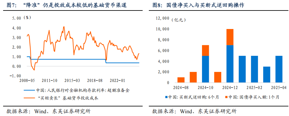 经济增长需要货币周转、货币周转需要流动性投放,因此“降准”在2010年-2013年外汇占款渐渐趋于稳定之后,承担起投放基础货币、满足经济增长需要的职责。2024年央行开始通过国债买卖投放基础货币,在2025年1月份国债买卖暂停之前,累计净买入1万亿元,但是从“基础货币投放成本”角度来看,我们以超额存款准备金利率作为“降准”的机会成本,截至2025年4月末“降准”的成本为35bps;分别以2年期国债收益率和7年期国债收益率的差值作为“买短期限、卖长期限”且保持净买入规模的基础货币投放成本,截至2025年4月末,“2倍买入2年期、1倍卖出7年期”所投放的基础货币成本则为130bps,从静态成本来看,“降准”依旧是投放成本较低的基础货币供给渠道。