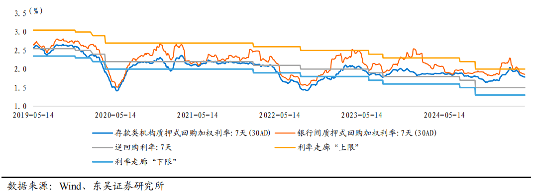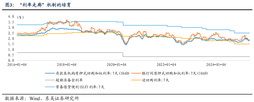 (1)利率调控:锚定隔夜或7天?收窄后的“利率走廊”操作期限缩短为隔夜回购,是否意味着隔夜正在取代7天期利率成为新的操作利率,2025年以来,DR007和DR001频频出现“倒挂”,出现这种情况的原因,或在于收窄后的“利率走廊”实质上锚定隔夜利率,与7天期回购利率相比,隔夜回购利率的主要参与方为一级交易商,货币政策对隔夜资金利率的可控性、可测性更强,其基准性也就更高。