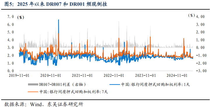 2025年以来,DR007和DR001频频出现“倒挂”,出现这种情况的原因,或在于收窄后的“利率走廊”实质上锚定隔夜利率,与7天期回购利率相比,隔夜回购利率的主要参与方为一级交易商,货币政策对隔夜资金利率的可控性、可测性更强,其基准性也就更高。2024年6月之后,DR007等拆借回购利率是银行间市场各交易商根据自身流动性需求、对拆借市场的判断成交出来的利率报价,DR007的上浮有利于金融机构提高管理流动性的主动性,此时货币政策的信号就是通过唯一的政策利率,即7天期逆回购利率来表达,因此在主要政策利率保持不变的情况下,DR007的波动引致债券收益率的波动,更多是银行体系杠杆率的变化,但是贷款利率等实体经济融资成本并不挂钩于回购利率,而是挂钩7天期逆回购利率,贷款供需的变化对DR007的变动并不敏感,反过来,银行短期管理流动性缺口也不会直接影响对实体经济融资的资金支持。