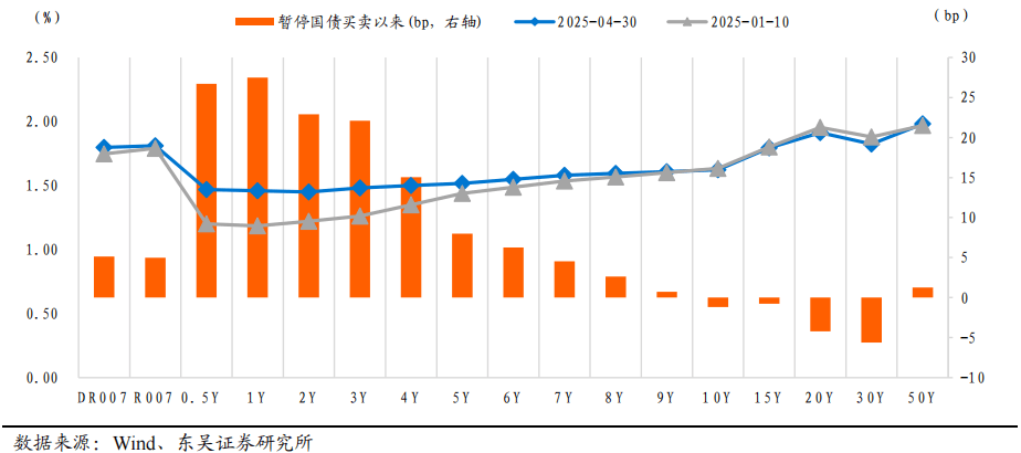 因此,长短端利率之间是否有效传导,决定了价格型货币政策的有效性。梳理2010年以来的利率市场化进程,中国始终存在金融市场的分割,在2015年至2018年打造初始版“利率走廊”时期,在培育DR007等市场回购利率发挥准政策基准利率的同时,也曾经尝试将Shibor利率体系打造为政策中介变量,但是由于当时“利率双轨制”的存在,市场利率向贷款利率的传导也存在障碍,直至2019年LPR报价机制改革,打破利率之间的阻隔,才畅通了利率传导体系。然而“缺失中介变量”的问题延续至今,从中国债券收益率曲线来看,2024年三季度央行开启国债买卖之后,收益率曲线存在明显的“期限分割”,央行和市场各自划分曲线的“势力范围”:(1)央行净买入主导1年-3年利率波动,2024年下半年买卖国债操作的实践表明央行更希望买入短期限国债,以短期票息弥补中长期卖债成本,因此1年-3年期限成为央行的“刚需”,并且彼时与DR007严重倒挂的1年-3年期限或也只有央行能够持续坚定买入,而在2025年1月央行暂停国债买卖之后,1年-3年期利率反弹幅度最高,从1月10日国债买卖暂停,截至4月30日,1年期至3年期利率均反弹超20bps;(2)市场交易盘主导10年-30年利率波动,由于2024年8月份和9月卖债分别集中在7年期和10-15年期,导致7年-10年成为“政策敏感区”,市场担心此范围会被央行“控盘”,押注“降息”会优先选择30年超长期限债券,导致2025年以来更长期限的利率反而成为更稳定波动的品种,在今年初国债买卖暂停之后,1年至3年期利率反弹的同时,10年期和30年期利率则分别累计下行1.18bps和5.62bps。彰显了收益率曲线分割的状态,也导致收益率曲线持续处于扁平化的形态。