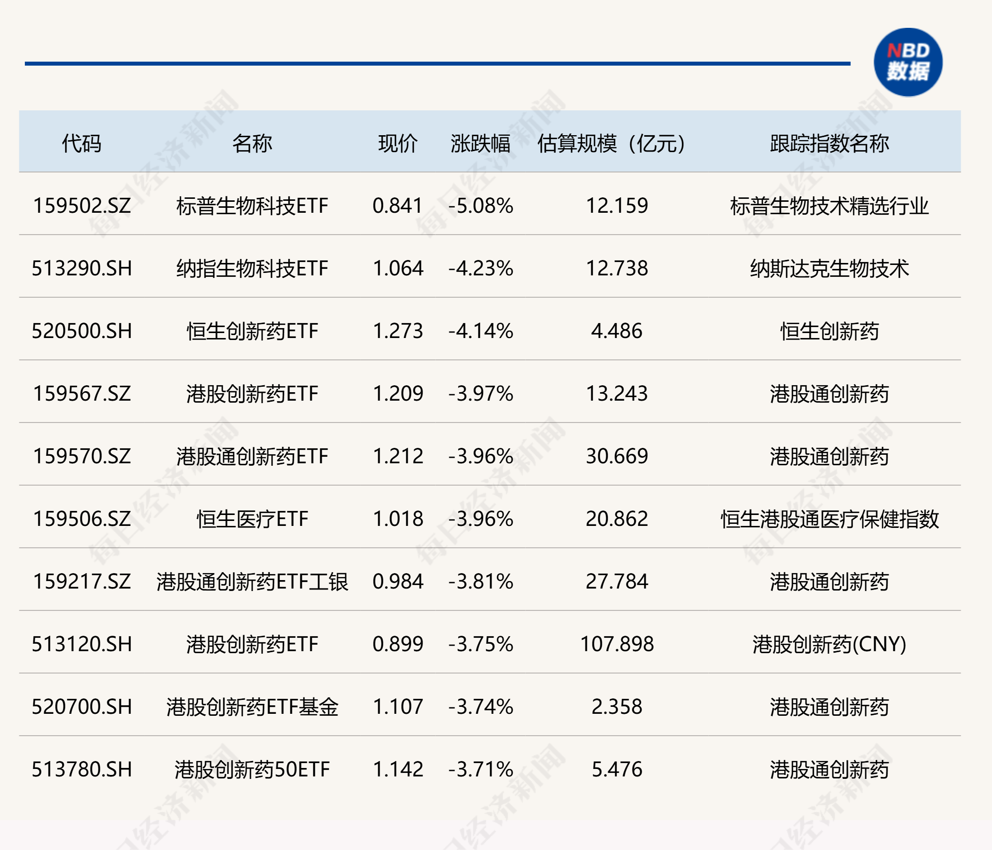 下跌方面,多只港股创新药相关ETF跌幅居前。