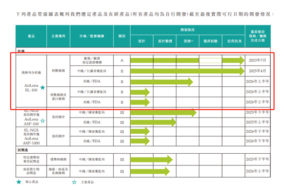 截至最后实际可执行日期,安序源科技的产品管线包括一款微阵列芯片分析仪、两款 EL-NGS 基因测序仪,以及多种配套检测试剂盒。其中,公司核心产品AxiLona EL-100是中国极少数能够执行基于电化学、多靶标、快速、低成本及整合式生物分子检测的分子诊断产品,其于2025年获得江苏省药监局第二类医疗器械注册证。