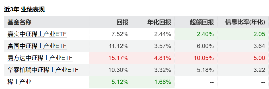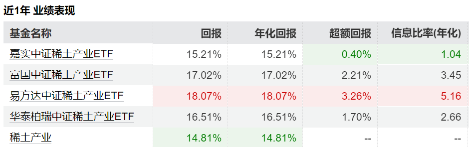 紧随其后的是富国中证稀土产业ETF,年化回报17.02%,超额回报2.21%,信息比率(年化)3.45,同样表现出色。