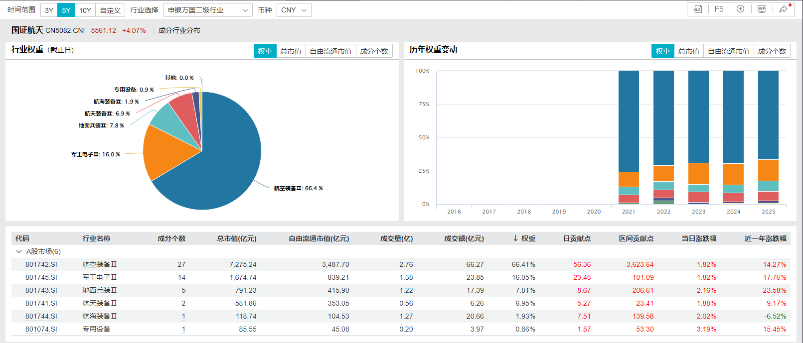 从行业分布看,国证航天申万一级行业中军工行业占比达99.1%,申万二级行业中航空装备、军工电子、地面兵装及航天装备分别占比达:66.4%、16.0%、7.8%及6.9%,指数前三大行业集中度达90%。
