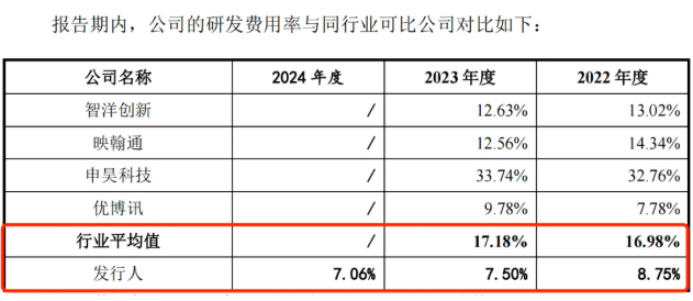 2022年和2023年,同行可比公司的研发费用率均值分别为16.98%和17.18%,远高于信通电子同期的研发费用率。