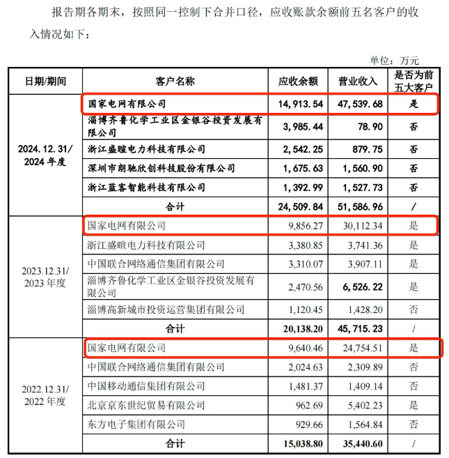 招股书显示,公司主要客户包括国家电网、南方电网等电网公司。报告期内,公司向国家电网有限公司(以下简称“国家电网”)的销售金额分别是2.48亿元、3.01亿元和4.75亿元,占当期营业收入的比例分别为31.66%、32.35%和47.30%,客户集中度有所提升。