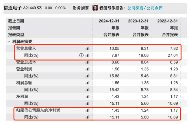 2022年至2024年(以下简称“报告期”),信通电子的营业收入分别为7.82亿元、9.31亿元和10.05亿元,同比增长27.04%、19.08%和7.97%;归母净利润分别为1.17亿元、1.24亿元和1.43亿元,同比增长10.69%、5.60%和15.11%。