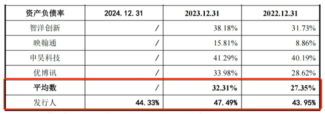 报告期内,公司资产负债率分别是43.95%、47.49%和44.33%。2022年和2023年,同行可比公司资产负债率平均值分别为27.35%和32.31%,远低于信通电子同期的资产负债率水平。