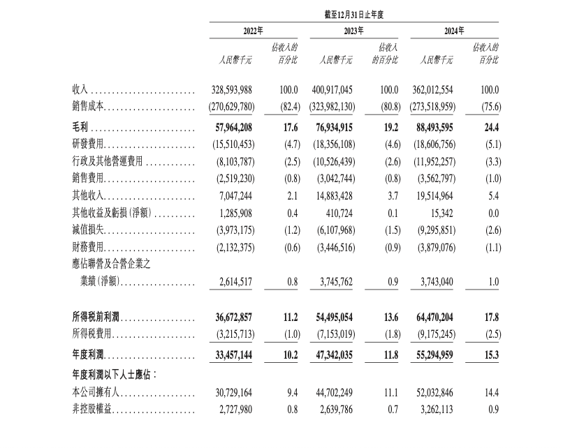 报告期内,宁德时代的收入分别约3285.94亿、4009.17亿、3620.13亿元;毛利分别约579.64亿、769.35亿、884.94亿元,毛利率分别为17.6%、19.2%、24.4%;净利润分别约334.57亿、473.42亿、552.95亿元。