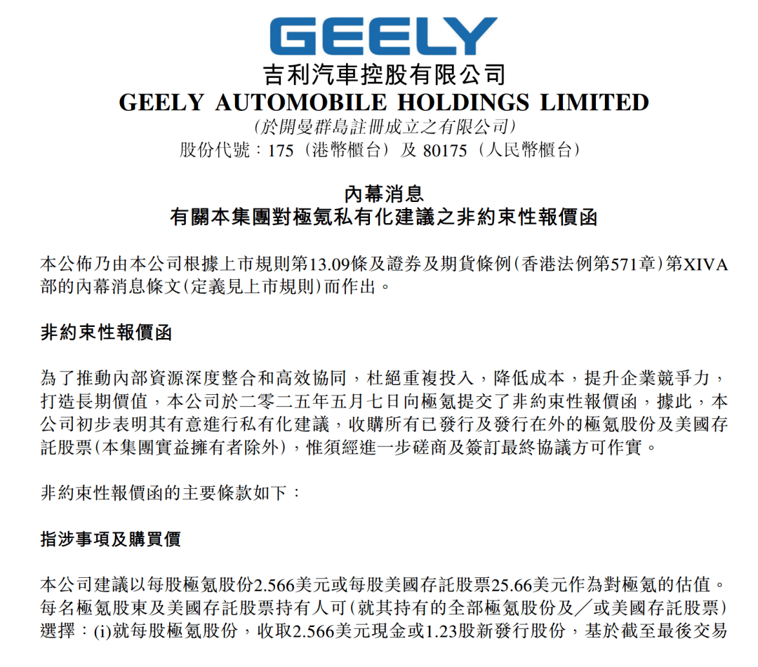 5月7日,吉利汽车发布公告,公司于5月7日向极氪提交非约束性报价函,建议私有化极氪,收购所有已发行及发行在外的极氪股份及美国存托股票(本集团实益拥有者除外)。