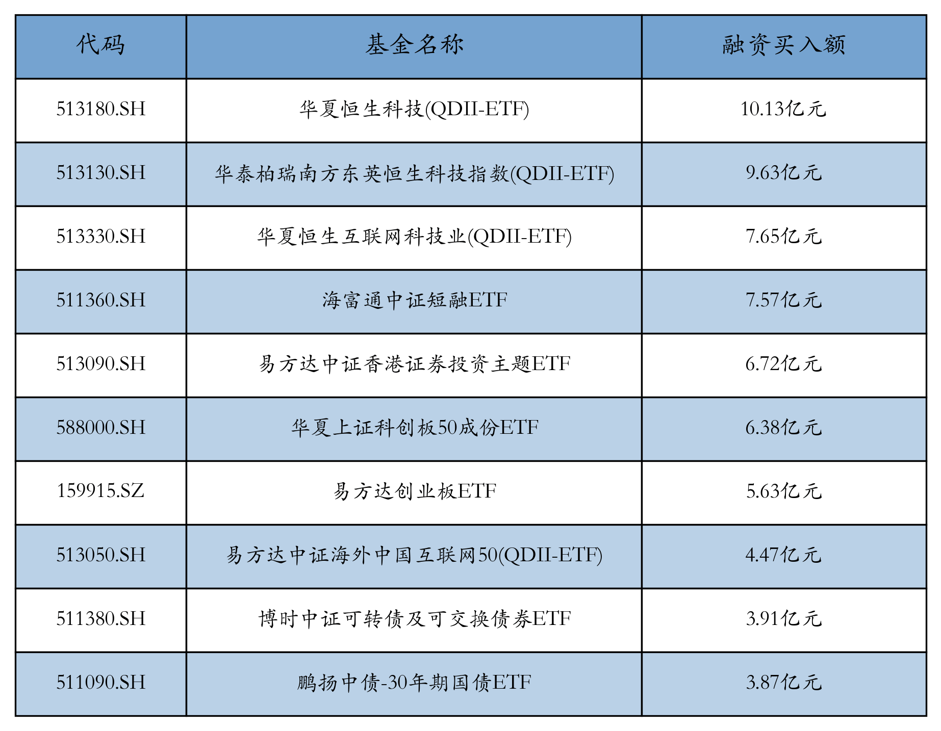 5月7日ETF融资买入额前三位分别为:华夏恒生科技(QDII-ETF)(10.13亿元)、华泰柏瑞南方东英恒生科技指数(QDII-ETF)(9.63亿元)和华夏恒生互联网科技业(QDII-ETF)(7.65亿元),前10具体见下表: