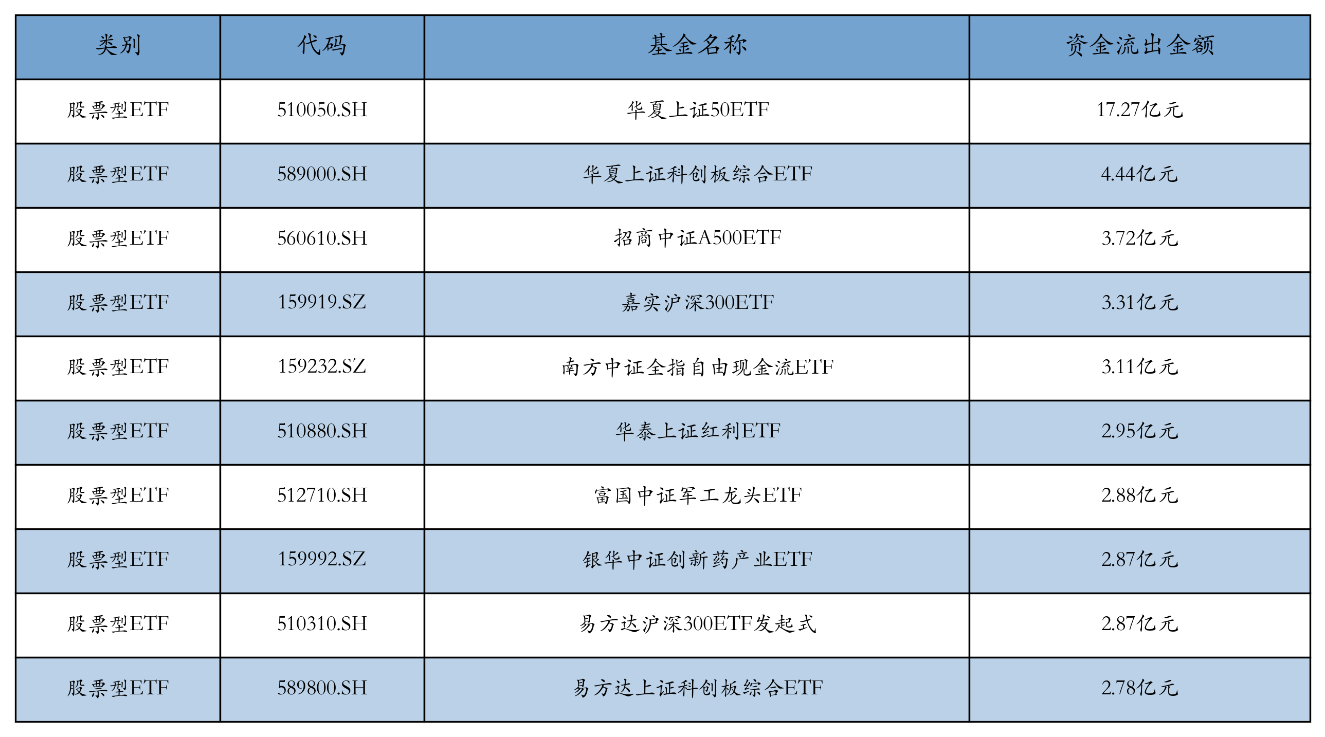 昨日股票型ETF资金流出最多的3支ETF及其流出金额分别为:华夏上证50ETF(流出17.27亿元)、华夏上证科创板综合ETF(流出4.44亿元)、招商中证A500ETF(流出3.72亿元)。资金流出前10详情见下表: