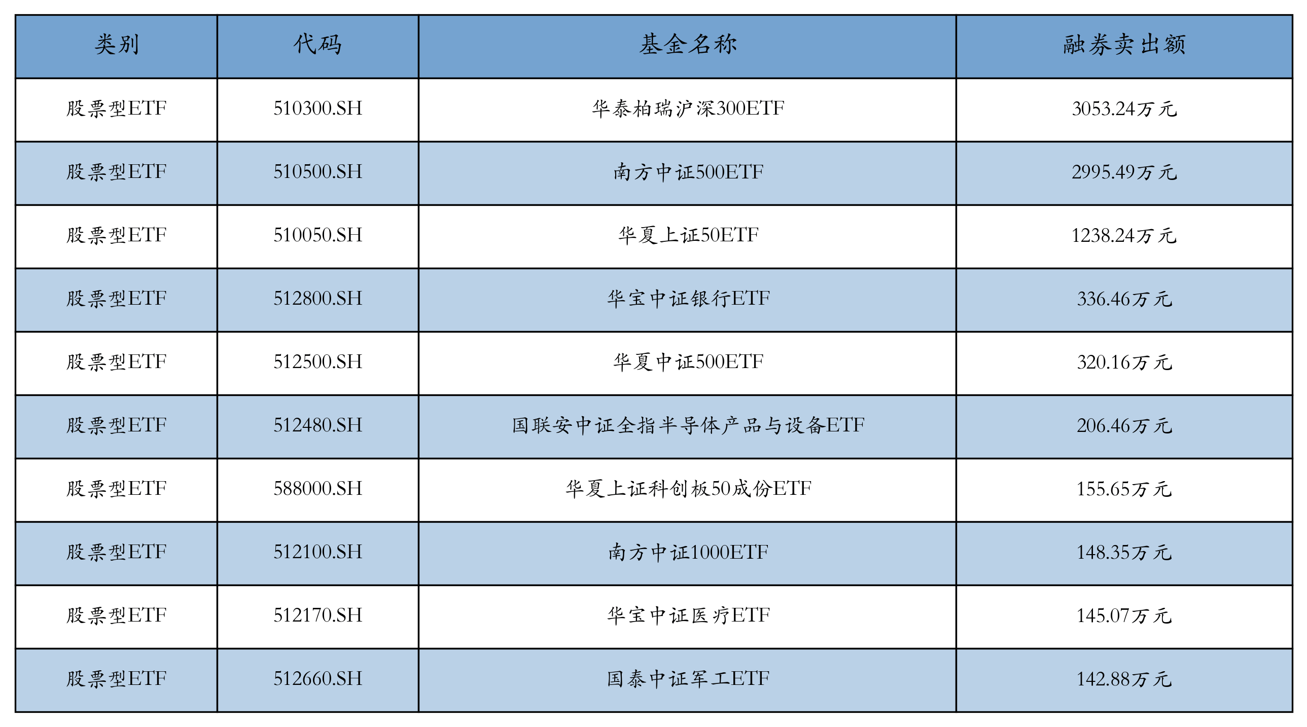 昨日股票型ETF融资卖出额最高的3支ETF及其卖出金额分别为:华泰柏瑞沪深300ETF(3053.24万元)、南方中证500ETF(2995.49万元)、华夏上证50ETF(1238.24万元)。融券卖出额前10详情见下表: