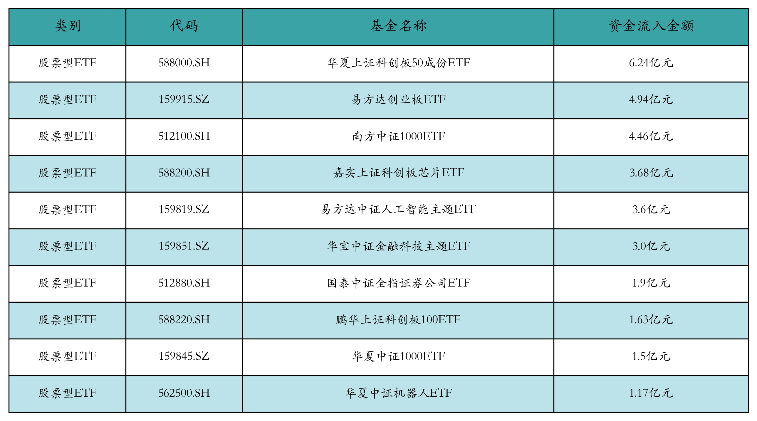 昨日股票型ETF资金流入最多的3支ETF及其流入金额分别为:华夏上证科创板50成份ETF(流入6.24亿元)、易方达创业板ETF(流入4.94亿元)、南方中证1000ETF(流入4.46亿元)。资金流入前10详情见下表: