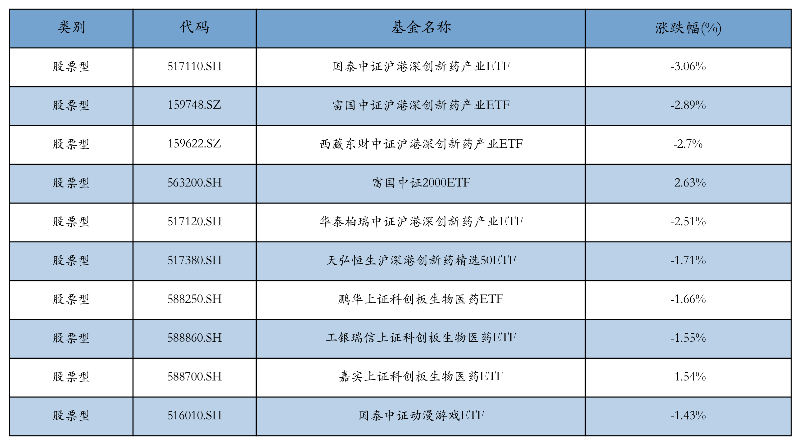 昨日股票型ETF跌幅最大的3支ETF及其收益率分别为:国泰中证沪港深创新药产业ETF(-3.06%)、富国中证沪港深创新药产业ETF(-2.89%)、西藏东财中证沪港深创新药产业ETF(-2.7%)。跌幅前10详情见下表: