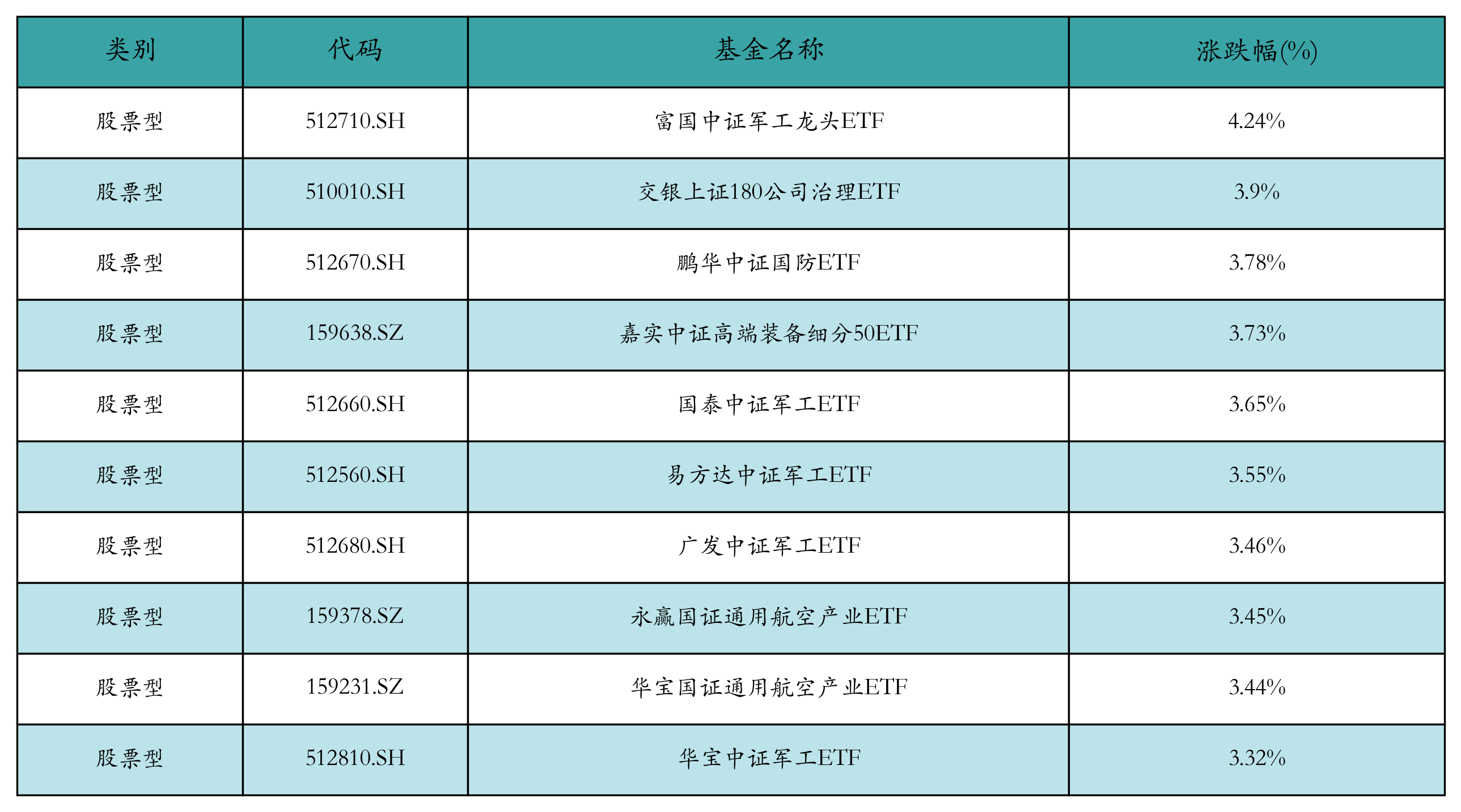 昨日股票型ETF涨幅最高的3支ETF及其收益率分别为:富国中证军工龙头ETF(4.24%)、交银上证180公司治理ETF(3.9%)、鹏华中证国防ETF(3.78%)。涨幅前10详情见下表: