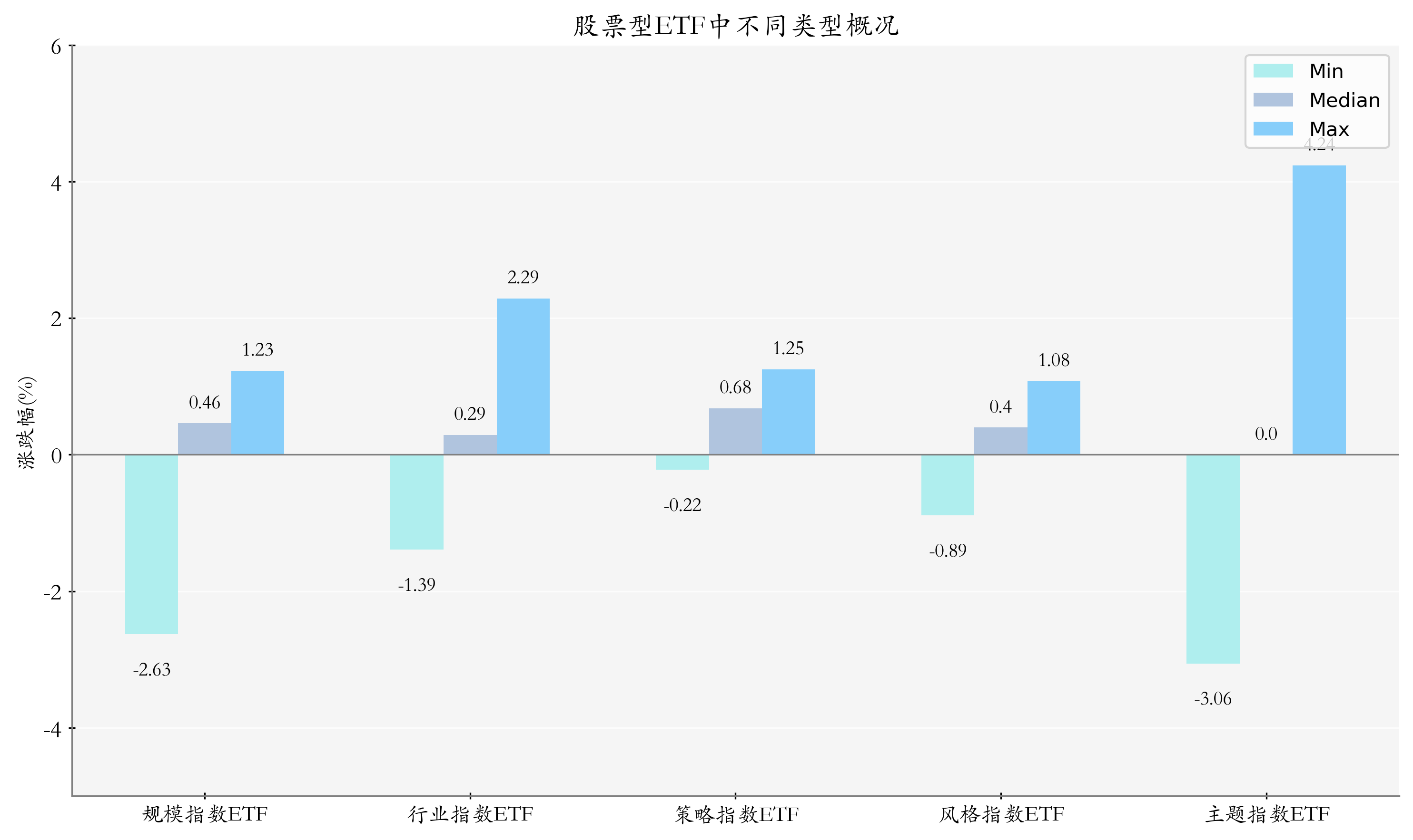 昨日股票型ETF收益率中位数为0.31%。其中按照不同分类,规模指数ETF中华泰柏瑞创业板50ETF收益率最高,为1.23%;行业指数ETF中鹏华国证粮食产业ETF收益率最高,为2.29%;策略指数ETF中建信沪深300红利ETF收益率最高,为1.25%;风格指数ETF中博时国证大盘价值ETF收益率最高,为1.08%;主题指数ETF中富国中证军工龙头ETF收益率最高,为4.24%。