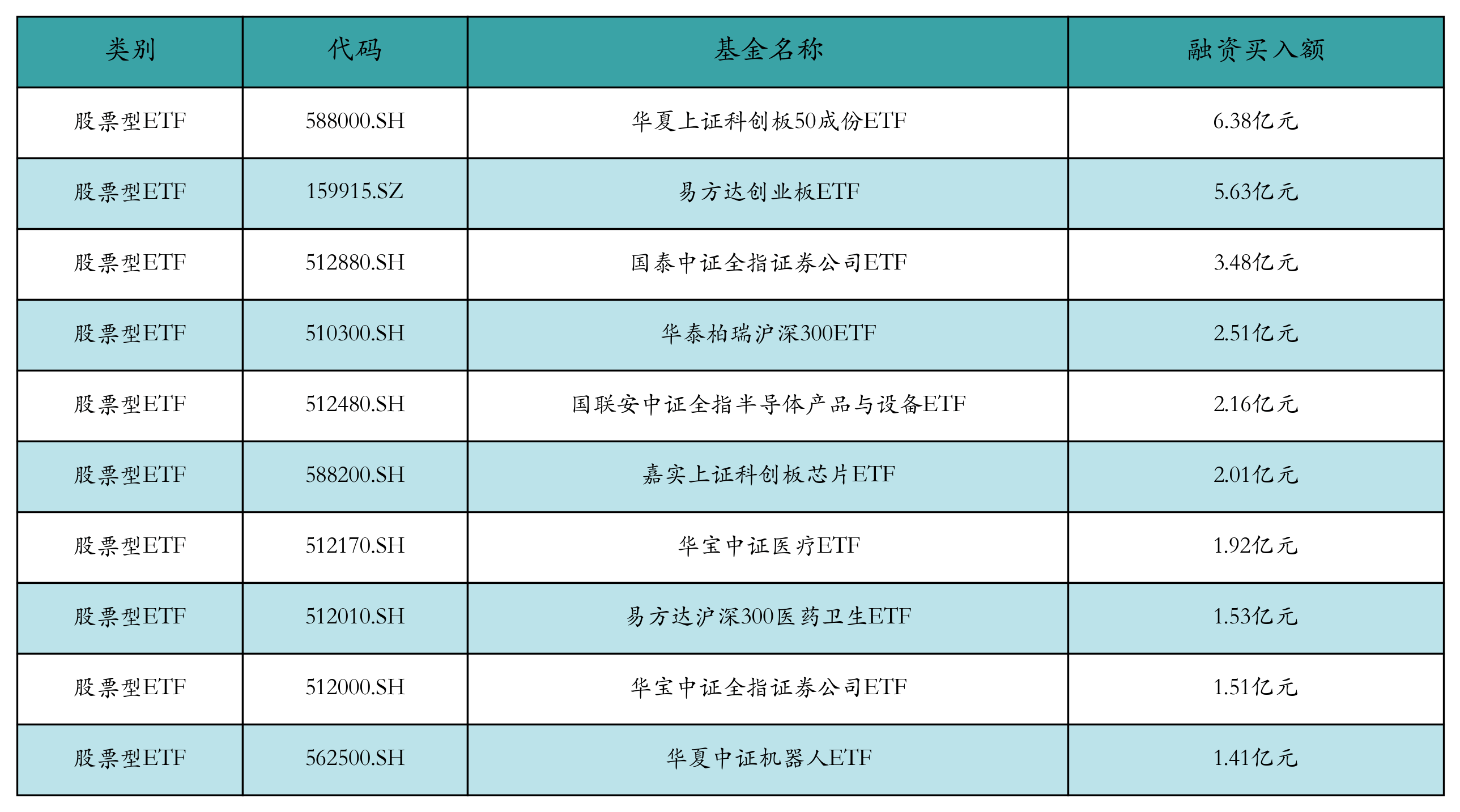 昨日股票型ETF融资买入额最高的3支ETF及其买入金额分别为:华夏上证科创板50成份ETF(6.38亿元)、易方达创业板ETF(5.63亿元)、国泰中证全指证券公司ETF(3.48亿元)。融资买入额前10详情见下表: