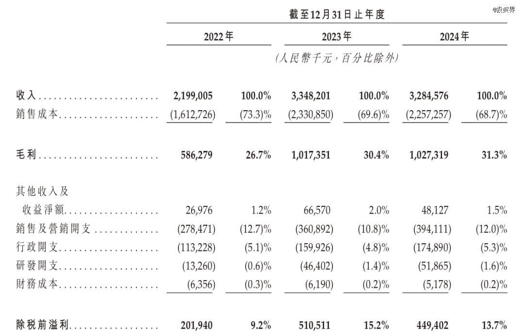 得益于加盟和下沉战略,招股书显示沪上阿姨2022年、2023年、2024年营收分别为22亿元、33.48亿元、32.85亿元;经调整利润分别为1.54亿元、4.16亿元、4.18亿元;利润率为7%、12.4%、12.7%;在此期间,沪上阿姨的毛利率分别为26.7%、30.4%、31.3%。