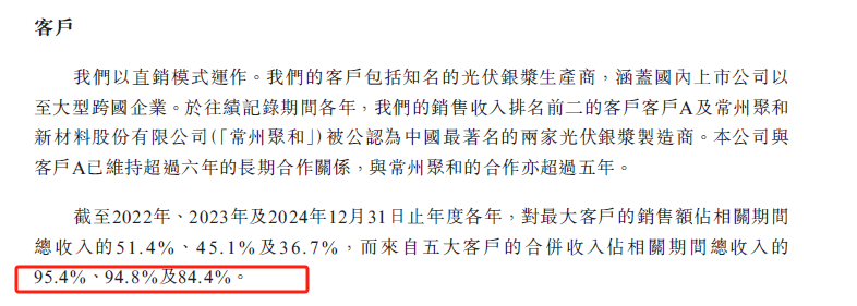 聆讯资料集披露显示,公司采用直销模式运营。公司的客户包括知名的光伏银浆生产商,涵盖国内上市公司到大型跨国企业。在过往记录期间的各年中,公司销售收入排名前二的客户客户A及常州聚和新材料股份有限公司被公认为中国最著名的两家光伏银浆制造商。