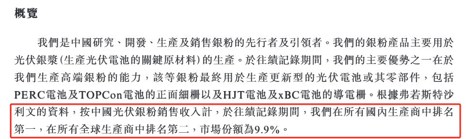 根据弗若斯特沙利文的资料,按中国光伏银粉销售收入计,在过往记录期间,公司在所有国内生产商中排名第一,在所有全球生产商中排名第二,市场份额为9.9%。