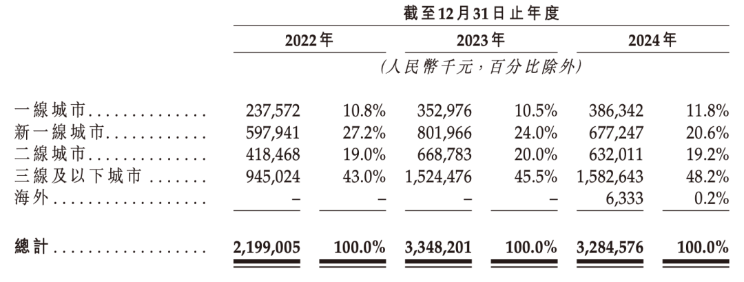 截至2024年年末,沪上阿姨开设在三线及以下城市的门店有4629家。同时,三线及以下城市也贡献了最多的GMV。2022年至2024年,三线及以下城市贡献的收入分别为9.45亿元、15.2亿元和15.8亿元,占比分别为43.0%、45.5%和48.2%。