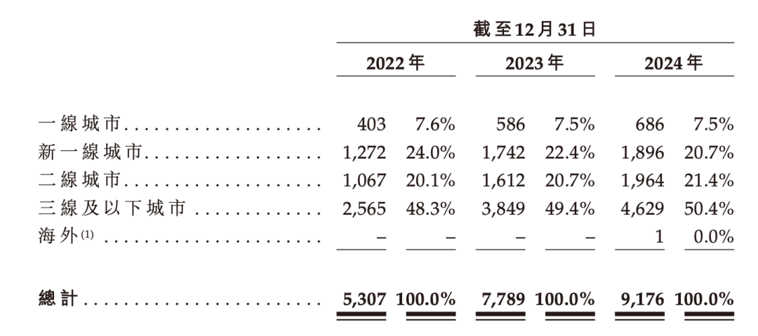 据招股书披露,2024年,沪上阿姨超过五成的门店位于三线及以下城市。从线级城市分布看,2024年沪上阿姨在一线、新一线、二线、三线及以下城市门店占比分别为7.5%、20.7%、21.4%与50.4%。