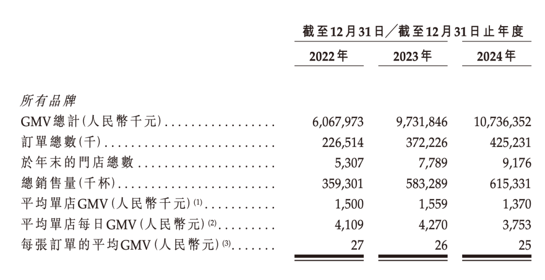 据招股书披露,沪上阿姨2022年GMV为60.68亿元,2023年增至97.32亿元,同比增长60.4%;2024年再升至107.36亿元,同比增长10.3%。但单店GMV受行业竞争加剧影响小幅下滑。