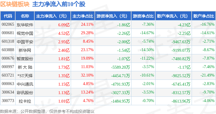 从资金流向上来看,当日区块链板块主力资金净流入2.87亿元,游资资金净流出14.29亿元,散户资金净流入11.42亿元。区块链板块个股资金流向见下表: