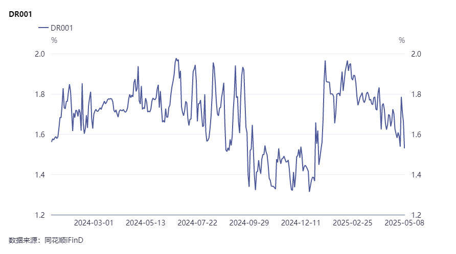 5月8日,DR001(隔夜质押式回购加权平均利率)利率水平相对上日有所下降,报1.5294%。