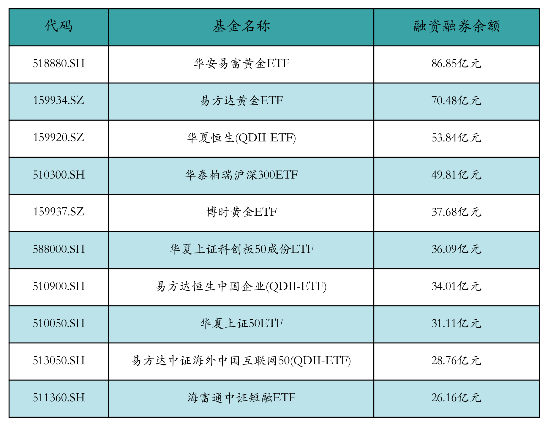 5月8日ETF两融余额前三位分别为:华安易富黄金ETF(86.85亿元)、易方达黄金ETF(70.48亿元)和华夏恒生(QDII-ETF)(53.84亿元),前10具体见下表: