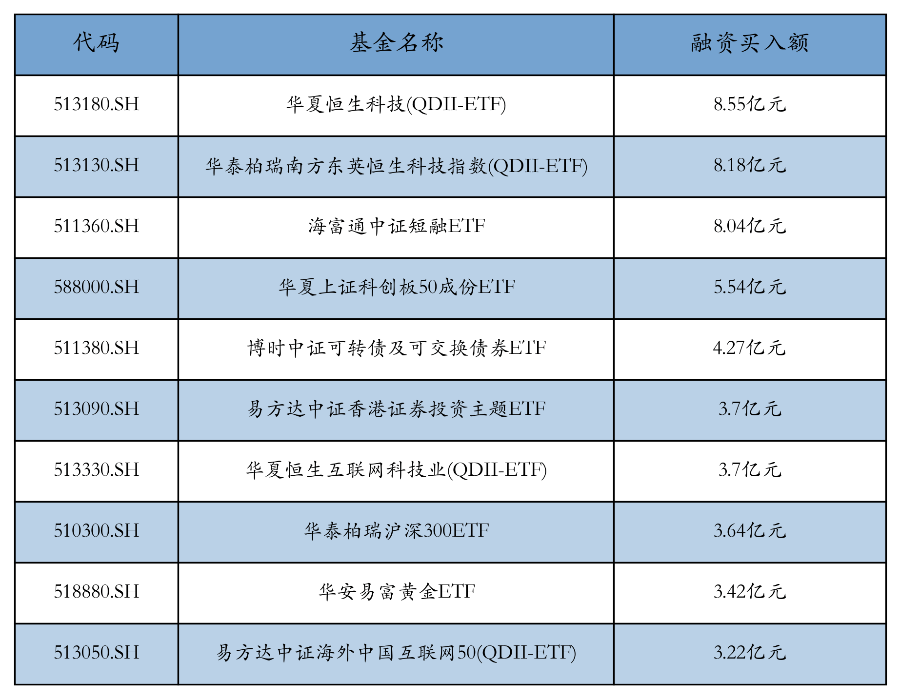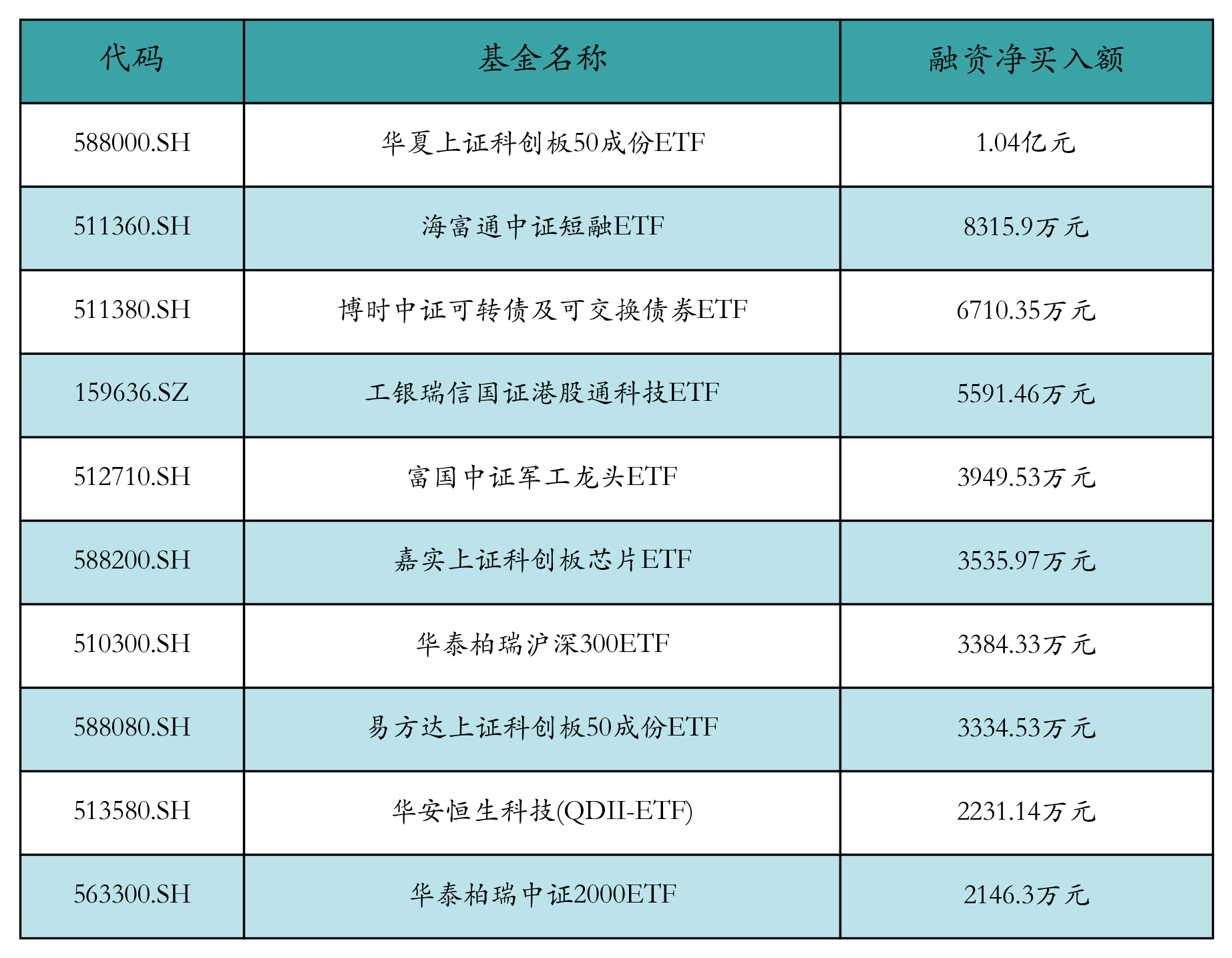 5月8日ETF融资净买入额前三位分别为:华夏上证科创板50成份ETF(1.04亿元)、海富通中证短融ETF(8315.9万元)和博时中证可转债及可交换债券ETF(6710.35万元),前10具体见下表: