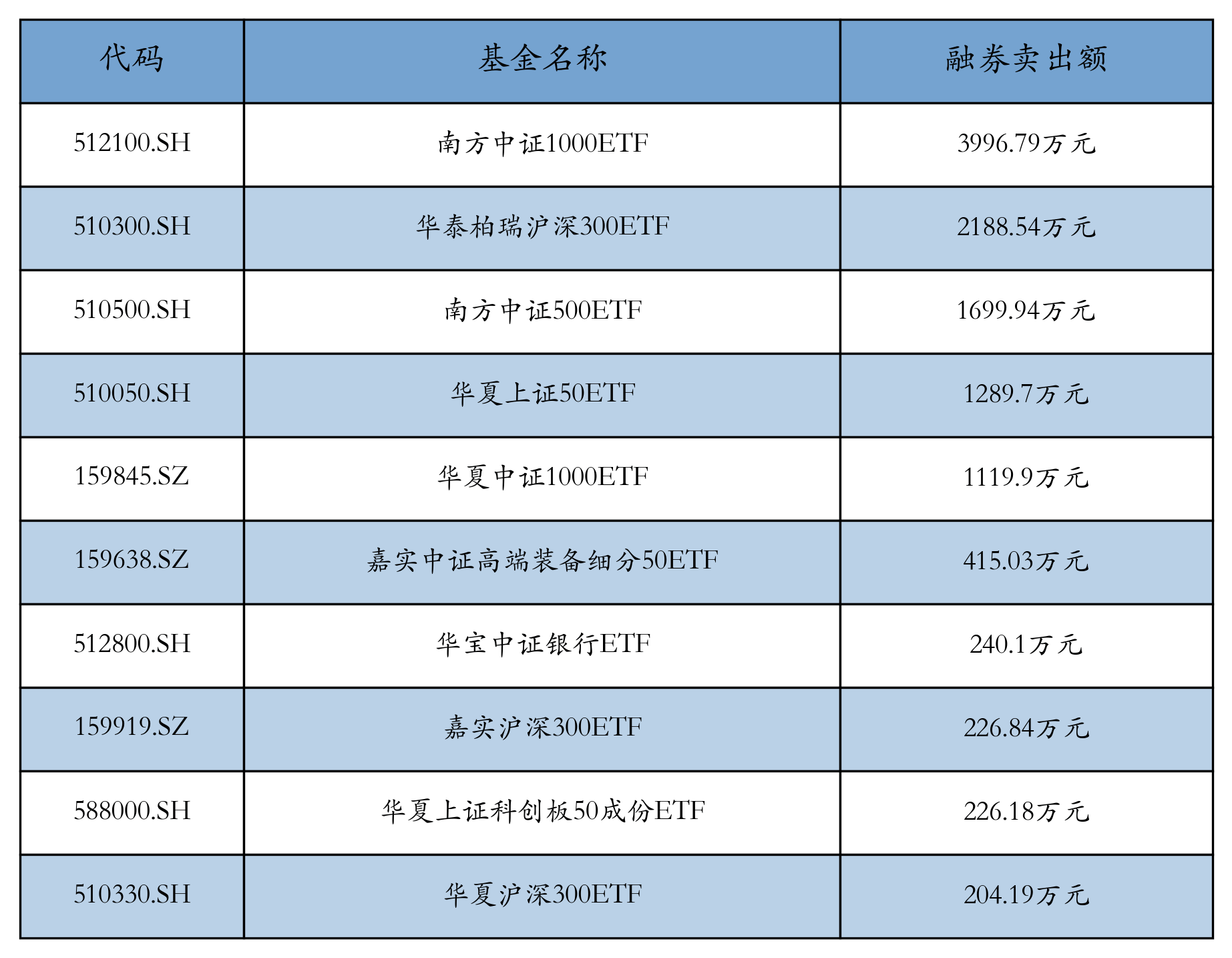 5月8日ETF融券卖出额前三位分别为:南方中证1000ETF(3996.79万元)、华泰柏瑞沪深300ETF(2188.54万元)和南方中证500ETF(1699.94万元),前10具体见下表: