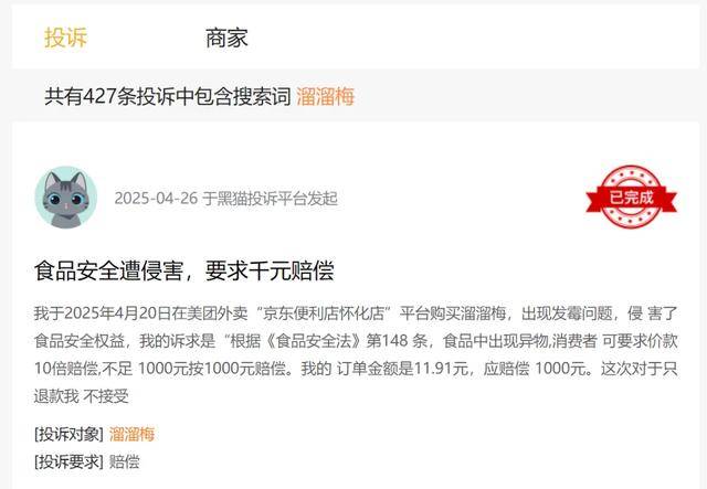 太追求营销的公司,往往会面临其它方面的质疑,比如品控、口碑。黑猫投诉平台上,关于溜溜梅有多达427条搜索关键词,涉及品质、服务等多个问题。一位消费者在平台投诉称,“溜溜梅清梅里面吃出来个石头的东西,给牙齿搁坏,打了客服电话好几天了,说有人联系我四五天了还没有人联系。”还有消费者投诉,“溜溜梅的梅冻发梅,商家不予理睬。”