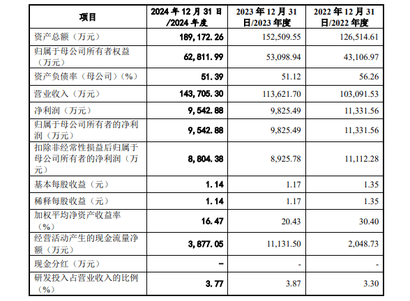 记者注意到,2022年度至2024年度,该公司营业收入分别为103091.53万元、113621.70万元、143705.30万元;扣除非经常性损益后归属于母公司股东净利润分别为11112.28万元、8925.78万元、8804.38万元。